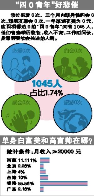 此外,在被调查的单身人士中,谈过恋爱0次的占14.58%,三个月内跟异性约会次数0次的占53.10%、平均每月跟朋友聚会0次的有12.29%,过去一年旅游花费为0元的占14.33%。而这四项都选0的“四0青年”共有1045人,他们普遍学历较低、收入不高、工作时间长,其中79.89%是男性,20.11%是女性。