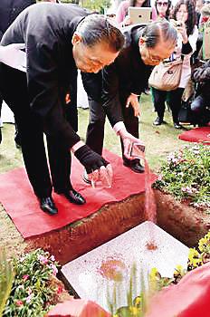 傅聪傅敏兄弟为父母之墓撒下泥土。