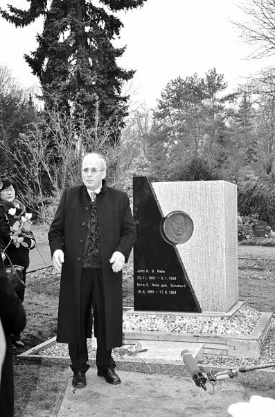 拉贝曾参加过纳粹,但并没有做过对不起人民的事情,在中国期间他曾以德国纳粹党员以及多重政治身份,说服打算对安全区实行运输封锁的日军,使粮食与药品成功运抵安全区,拯救了数十万人的性命。然而纳粹党员这个“污点”,使某些德国人对拉贝的评价不够公正。拉贝1950年在柏林去世后下葬于威廉皇帝纪念堂墓地。1985年,由于墓地租用到期,无人续租,管理部门便拆除了墓碑。中国方面曾与柏林市政府多次沟通协调,希望柏林市政府能将拉贝墓地列为历史名人墓地予以免费长期保留,但遭柏林市政府婉言拒绝。早在2005年,一些中国留学生就提出,日本甲级战犯的灵位被高高地供奉在靖国神社、受人膜拜,而在德国土地上竟然没有任何一处拉贝先生的纪念碑。中国留学生自发组织起来,为拉贝捐献了一座塑像,并在二战结束60周年之际举行了落成仪式。此后拉贝的长孙托马斯·拉贝与中国驻德大使馆商量,希望能续租拉贝墓地原址并重修拉贝墓碑。我驻德使馆随即与南京市联系,并得到了南京市的大力支持。南京市政府为该项目特批了105万元人民币专项资金,用于墓碑制作、运输和40年墓地租用等。墓园修建工作于2013年11月完成。史明德大使在拉贝揭幕仪式上接受本报记者采访时谈到,“黑白组合的墓碑如同白纸黑字一般记录下那段历史事实,也象征着那个黑色的时刻和纯洁的人性。我们今天站在这里,是为了共同缅怀中国人民的朋友和恩人,是为了共同回忆那场战争给世界各国人民造成的空前劫难,是为了共同纪念全世界爱好和平的人民为捍卫人类尊严和赢得世界和平团结奋战的历史壮举。”