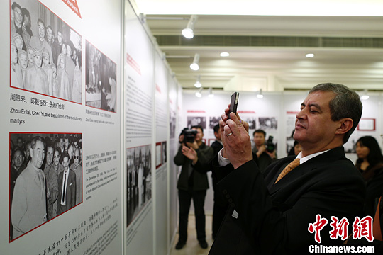 图为阿尔及利亚驻中国大使哈桑纳·拉贝希用手机拍摄展板上周恩来总理的照片。中新社发 富田 摄