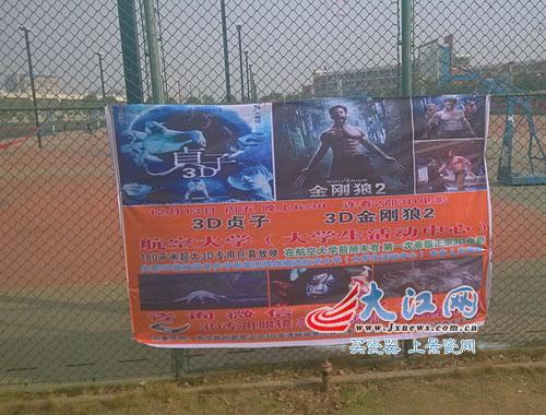12月13日中午,记者在该校看到,多块电影放映活动的宣传海报悬挂在运动场围栏上。有学生告诉记者,此前他曾在寝室收到过发放的宣传单。