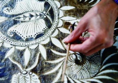 离开雷山,我又到了丹寨,这里的蜡染技艺闻名天下。苗族姑娘从几岁开始和母亲学习蜡染,十五六岁时就已练就一手娴熟的技艺。在众多的艺人中,杨二郎引起了我的注意。十年前,她在上山砍柴途中不慎失去了右臂,但为了给在昆明上大学的儿子挣学费,杨二郎坚持从事蜡染技艺。她家中的两个女儿,也都传承着家业。2009年,安徽客商宁曼丽来到这里,将杨二郎的作品带到了美国,让传统的苗族工艺走入了国际市场。