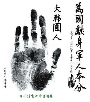 1907年参加义兵运动,但与日军作战都失败了。1909年3月,安重根与姜基顺等11人在克拉斯基诺开会,亲自切断了自己左手无名指的一个关节,用热血在韩国国旗———太极旗上书写了“大韩独立”四个汉字,并写下“安重根”三字,创建了“断指同盟会”。