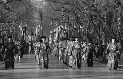 昨日上午,由260名演员组成的祭天仪仗队伍从天坛的斋宫出发,一路行进到祈年殿南砖门。随着罡筒发出低沉、浑厚的长鸣,由天坛职工扮演的皇帝身穿龙袍从斋宫内缓缓走出,接受文武百官行跪拜礼之后,移步上轿。
