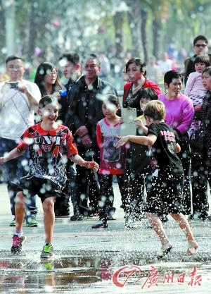 `昨日天气炎热,外国小朋友在玩喷泉。记者王维宣 摄
