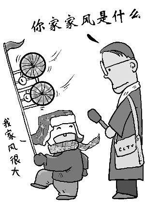 春节期间,央视《新春走基层·家风是什么》系列报道,引发公众关注。有“富二代”回答家风就是“不啃老不坑爹”;有香港影星说家风就是“退一步海阔天空,国比家大”;还有小孩说家风就是“爸爸每周打我一次”;更有网友给出“神回答”:“我家风很大”。(2月9日《华商报》)与之相近的,郭德纲8日在儿子郭麒麟18岁生日之际,于微博发表了一篇家训。他告诫儿子:一入江湖深似海,从此节操是路人。有人夸你,别信。有人骂你,别听。(2月9日《现代快报》)
