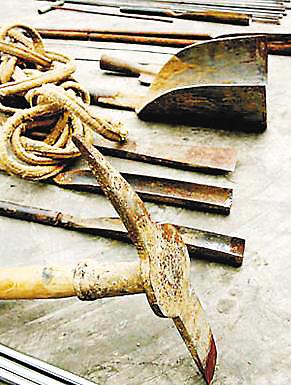 从陕西韩城大墓盗墓者手中缴获的盗墓工具,包括铁锨、绳索和大小不等的洛阳铲。