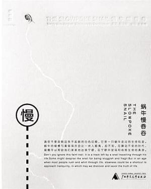 《蜗牛慢吞吞》,这个书的设计一定不张扬,一定不讨好读者。这个书讲蜗牛,蜗牛是什么状态?蜗牛是悠然自得,不伤害什么,静静在墙脚,在树丛上慢慢地爬,这个不能太猛烈。这个书一看,没东西,文字是凹凸压进去的,你可以看到一个小蜗牛在灰色的纸上爬,然后我做了UV,就是蜗牛爬过的痕迹,这个是要在特定光线下才能捕捉到的。里面是我手绘的一些东西,画了一年多,就是把自己的节奏慢下来,像蜗牛一样慢下来。我养了两只蜗牛,用很多的时间研究我的蜗牛,下雨天也会看看。书用的是芬兰进口纸,硬精装,我决定要给读者好的书,让大家看着舒服的一本书。