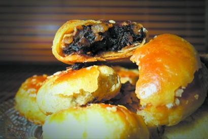 上海小吃蟹壳黄,也深得人心。它用油酥加酵面作坯,做成扁圆形小饼,面上粘着一层芝麻。贴在烘炉壁上烘熟,形圆,色黄似蟹壳。石门一路威海路口吴苑饼家,是供应蟹壳黄的名店。
