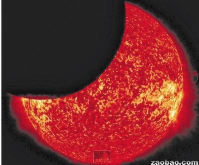 据报道,1月30日当天,月球从美国宇航局的太阳观察卫星和太阳之间运行而过,将火红的太阳局部遮蔽了。