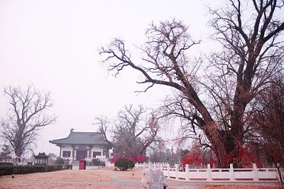 排行第二的“仲者”,名为“撑天覆地”。因为这一株,桠杈纷披,横斜逸出,屈曲盘旋,斑疤鳞列,是三株古树中,最为高大的。据介绍,树高有近25米,树冠也是26米左右见方,而且枝叶繁茂。“仲者雍穆拱名次……怒枝高亚力撑天,繁荫勃香罗地。”林老三句,古银杏的神韵活灵活现。