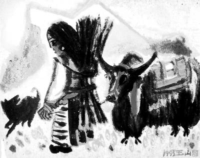 藏女和她的牦牛(水墨) 1993年 刘玉山