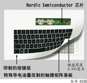 据国外媒体报道,Novalia公司上周宣布,他们正在开发一种可以印刷在纸上的便携键盘,其厚度能薄至0.005毫米,并具有普通键盘的正常功能。这种键盘完全是触摸式的,没有任何机械装置。整个键盘研发完成后,预计其除去电池的重量仅为30克。“纸质键盘”配有一枚芯片,控制蓝牙连接和输入控制,其超低功耗性能可保证长达18个月的电池续航。