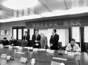 施拉普诺夫专程来华为作家阿莹佩戴契科夫文学奖勋章