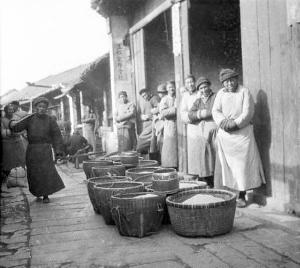 老照片上,80多年前的小镇居民和郊区农人,似乎穿越时空,来到我们面前。路边茶馆内,一位老者坐在桌旁,悠闲地喝茶;卖烧饼的男孩子,回头好奇地看着摄影师;小镇饭店的厨师,在“缸缸灶”旁煮饭;男孩子帮着家人挖水井;秣陵关镇的米行前,卖米的农民,拿着盛米的箩,好奇地盯着摄影师的镜头……