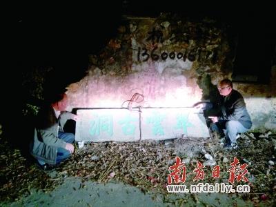 黄先生星夜察看“翠云古洞”石匾。林晓琼 摄