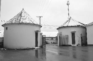 昨天上午,记者在桠溪镇赵村村北一处老粮库大门囗看到,两幢圆形的房屋在大门左右,屋顶盖了黑瓦,墙壁被刷了石灰,屋檐四周下面还有木窗,靠近东面有个大门。一位村民告诉记者,这两幢房屋前几年刚修过,以前曾被作为仓库。