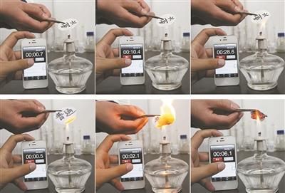 图为科研人员在实验室内对比展示“耐火纸”的特性,“耐火纸”在酒精灯的火苗上滞留近30秒没有发生自燃(左图);而普通纸张顷刻间被酒精灯点燃,从完好状态到化为灰烬仅用时6秒左右(右图)。