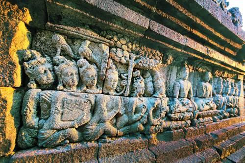 婆罗浮屠每一层的回廊上,都刻有上千幅佛教故事的浮雕
