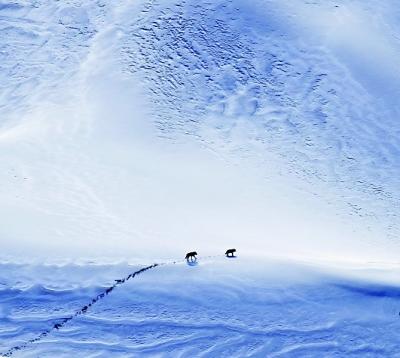 2013年11月14日,中国新疆。一对野狼在大雪覆盖下的沙漠中行走,11月初是野狼一年一度交配的季节