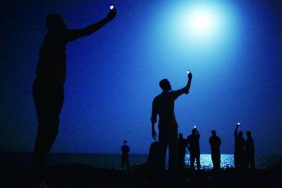2013年2月26日吉布提首都吉布提市海岸,移民们举起手机,尝试连接邻国索马里的廉价信号,好与外国的亲人联系