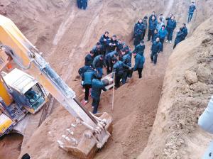 昨日下午,记者赶到事发地,一台大型挖掘机正在紧张施工,现场已经挖出很多土方,挖出的坑已经足有十五六米深,周围有数百名群众围观,泾阳公安局的民警在现场维持秩序。到下午四时三十分,挖掘机挖出了一把铁锨、一台矿灯和疑似文物,但还是没有发现被埋男子,在挖掘机工作的同时,村民准备引线架设照明灯,一个小时后突然发现了一具尸体。