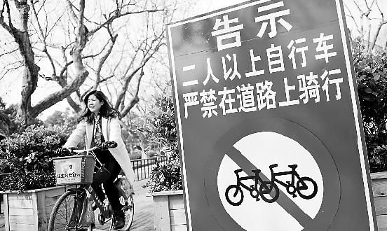 昨天湖滨路上竖起醒目的告示:禁止双人自行车通行。李震宇王飞超摄