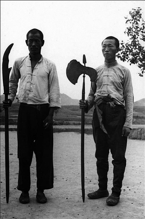 两个穿得也算整齐的农民拿起武器,虽然是当地古代留下来的土玩意儿,也表现了中国人的抗日意志。
