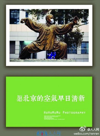 多地雾霾来袭 网友自发给雕塑戴口罩晒照(图)(5)