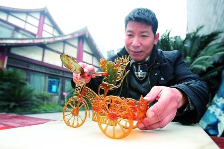 昨日,巴国城,糖画传承人刘贵兵展示刚制作好的“3D”糖画。记者 龙在全 摄