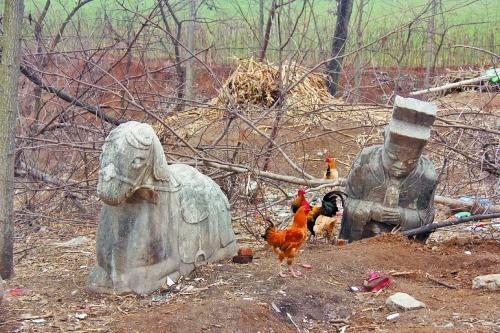 在村民胡建良家门口,记者看到了摆放在那里的一匹石马,长1米多,重达2吨以上,雕工精美,栩栩如生。旁边是半埋在地下的文俑和断头武俑。在村子里的几处柴草垛里,记者见到了村民藏的石猴、石虎等石雕。
