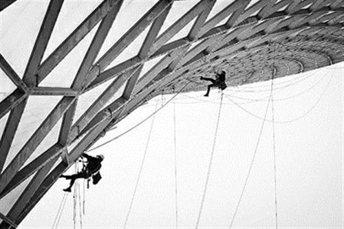 图为昨天,吊装工人正在“飞天”作业,安装灯光轨道。 记者 陈龙摄