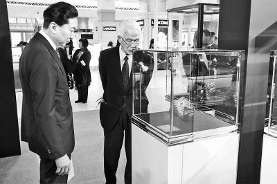 2月26日,华人艺术大师陈世英珠宝雕刻艺术展“生命的共鸣”在日本东京开展。展出的百余件珠宝雕刻精品吸引了众多嘉宾驻足观看。图为日本前首相鸠山由纪夫(左)在观赏展品。本报记者 谢宗睿摄
