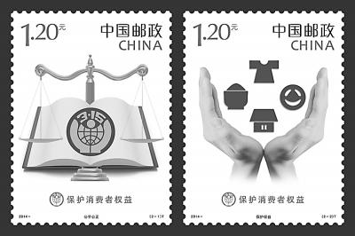 今天,中国消费者协会与中国邮政集团公司在京共同举办了《保护消费者权益》特种邮票的首发仪式。邮票1套2枚,面值2.4元。邮票设计第一图以中消协会徽及天平为主要元素,突出表现保护消费者权益的法律依据;第二图用一双手托举起代表“衣、食、住、行”的4个图标,寓意消费者权益得到了广泛全面的保护,惠及百姓生活的各个方面。本报记者 杨滨 D044