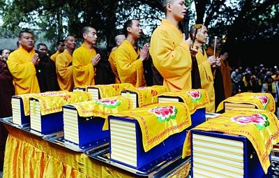 12日,河南登封嵩山少林寺山门大开,方丈释永信率众弟子山门前迎奉手工木刻印刷版《清敕修大藏经》。释永信说,藏有3万多册古籍的少林寺藏经阁有北宋、南宋、明、清等时代的《大藏经》,多为影印本或缩印本,且均不完整,受赠的这部《大藏经》是少林寺唯一完整的。