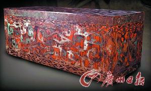 1972年,在长沙市区东郊浏阳河旁的马王堆一号墓挖掘出土的朱地彩绘棺,在黑漆素棺、黑地彩绘棺之内,是套棺的第3层。长230厘米,宽92厘米,高89厘米。是西汉长沙国丞相、第一代轪侯利苍的妻子辛追的葬具。它通体内外皆鬆朱漆,外表朱漆地上,用青绿、粉褐、藕褐、黄白等色,彩绘龙、虎、朱雀、鹿和仙人等“祥瑞”图案。每个面的纹饰图案都不相同,内容丰富,绘画技巧高超。以绚丽之色彩和迷幻之图像为世人呈现出楚文化中独具特色的、瑰丽奇伟的神秘仙境。是我国漆器工艺史上不可多得的艺术珍品。