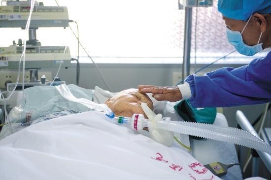 卢业香老人接受治疗时,儿子翁祚雄在一旁陪伴她