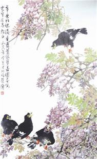 图为:苏葆桢八哥紫藤花鸟图