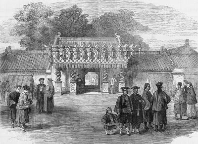▲位于东堂子胡同内的新娘家大门。同治皇帝大婚的日子,按照清政府给驻京各国大使的照会,要求各位公使禁止本国的公民上街观看婚礼仪式,但辛普森并没有把这个通知太当回事,他早早就进行了策划,与几位朋友及向导躲在一家婚礼队伍必经的鸦片馆内,偷窥了整个的婚礼队伍的行进过程,并写下一篇详细且“惊心动魄”的文章发表在《伦敦新闻画报》上。