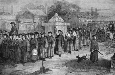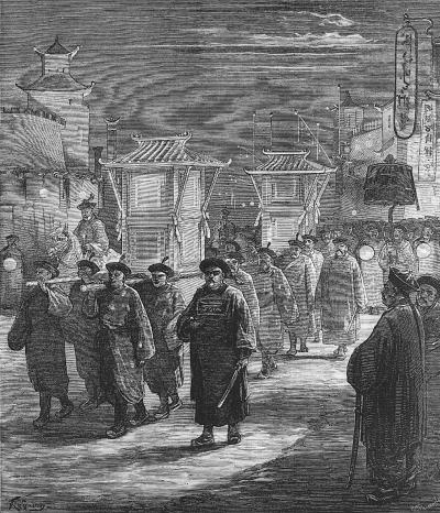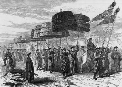 ▲迎接新娘的仪仗队。刊登于1872年12月28日《伦敦新闻画报》,木刻版画。根据辛普森的描述,这些轿夫穿着红色外衣,上面装饰着白色的圆点。队伍最前面举的是绣有龙凤图案的各色旌旗,后面是三重华盖,再后面跟着新娘乘坐的花轿。