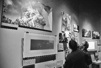 5月14日,几名参观者在“9·11”国家纪念博物馆内观看纽约世贸中心遭遇“9·11”恐怖袭击的现场图片资料。