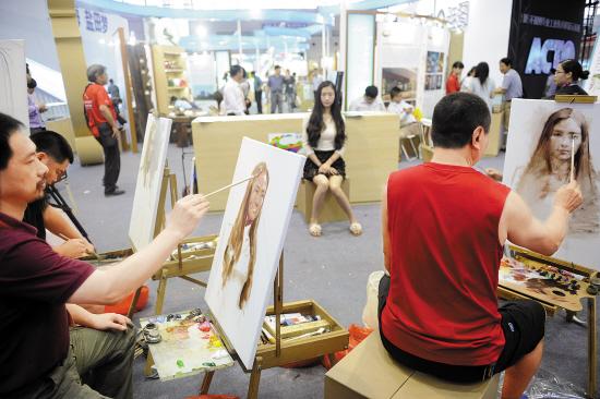 昨日在文博会龙岗展区,大芬油画村的画家们以不同笔法共同为模特作画 羊城晚报记者 王磊 摄