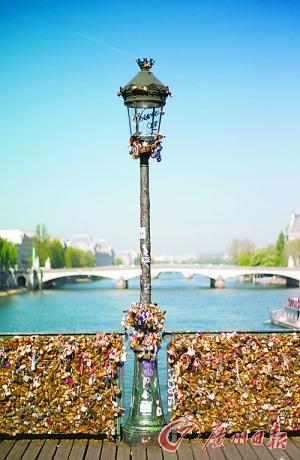 本报讯 据法国媒体9日报道,巴黎锁桥的正式名称叫“艺术桥”(Pont des Arts),位于巴黎卢浮宫前的塞纳河河面上,是闻名世界的“爱之锁”桥。桥两侧的护栏由铁网构成,上面密密麻麻地锁着大大小小、形状不一的锁,很难数清到底有多少。每把锁上面都写着两人的名字,多数还画上1颗心,象征爱情恒久不变。到巴黎锁桥上锁上一把同心锁,然后把钥匙丢进塞纳河,已经成为每年世界各地数以万计的情侣到巴黎必做的事情。