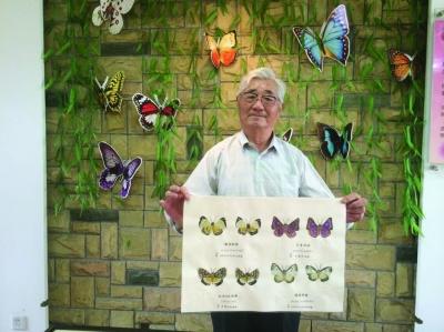 杨老展示自己制作的“树叶蝴蝶标本”。
