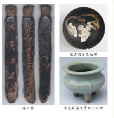 考古专家表示,此次出土了一件写有“判府□□□□丘右司□内造”、“戊寅正月分”文字的三棱状漆木器;挡水墙北坡和西侧边壁之间出土了一批较为完整的瓷器,主要有龙泉窑的香炉和碗、吉州窑黑釉碗等,其中宋代龙泉窑鬲式炉、元代龙泉窑双鱼洗造型优美,釉色莹润;出土的铜钱有“景德元宝”“嘉祐元宝”“熙宁元宝”“熙宁重宝”“元丰通宝”“元祐通宝”“大观通宝”“圣宋元宝”“建炎通宝”“祥符元宝”等。