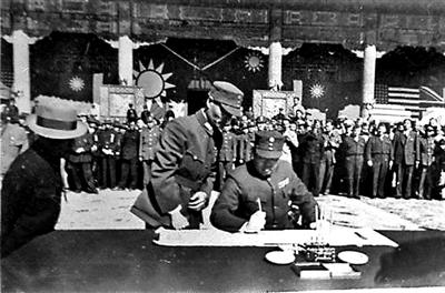 司仪宣布:“日本投降代表人根本博签字”。就见根本博来到台前,在两份降书上签字,退回原位。“中国受降主官签字”。司仪宣布后,孙连仲上将在“受降主官”栏下签字,退回原位。象征日本武士道精神的军刀,在受降仪式上作为投降象征,随着司仪高声宣布“日本投降人员献刀。”根本博、高桥坦、渡边等5名日军头目逐次献刀。