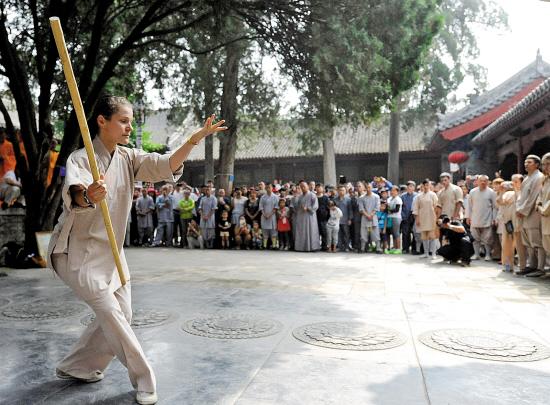 少林“洋弟子”们先后表演了五步拳、七星拳、八步连环拳、短棍等少林传统功夫。但见,一身僧衣、僧鞋打扮的玛莎独自打完一路少林大洪拳后,又跟随其他“洋弟子”连续表演多套少林功夫。