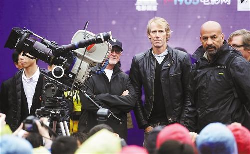 2013年10月30日,武隆仙女山,《变形金刚4》导演迈克尔·贝(右二)和创作团队在开机仪式上与中国观众和粉丝见面。 (本报资料图片)