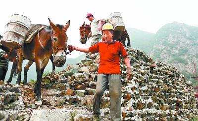 位于延庆县八达岭镇境内的古长城73楼至76楼段,历经数百年的自然风化,墙体多处出现坍塌、开裂。延庆县文物管理所近日展开抢险加固工程,施工人员用骡子和毛驴驮着建筑材料运送到施工地段。