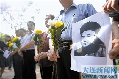 7月29日,参加公祭活动的嘉宾手持邓世昌画像和鲜花追忆甲午将士。